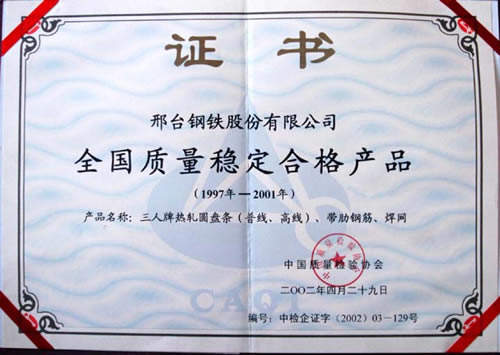 The Three Person brand hot rolled,torsion-free and controlled cooling wire was awarded the Quality Products of Hebei.