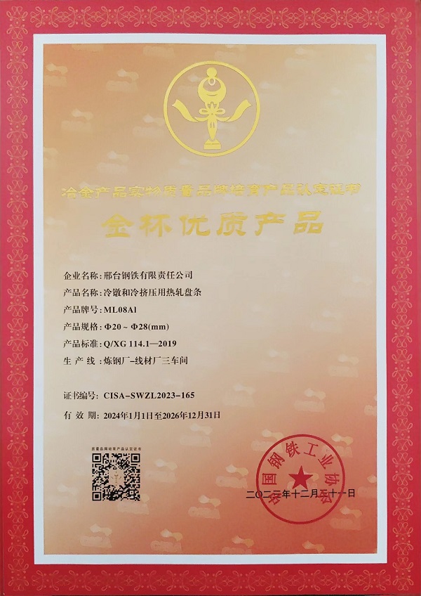 冷鐓和冷擠壓用精品盤條SCM435φ23mm;φ14-φ16mm規(guī)格獲冶金產(chǎn)品實物質(zhì)量金杯優(yōu)質(zhì)產(chǎn)品認定證書