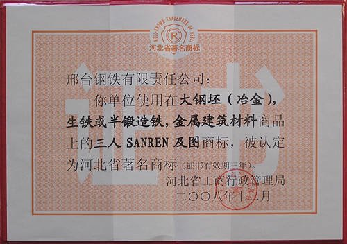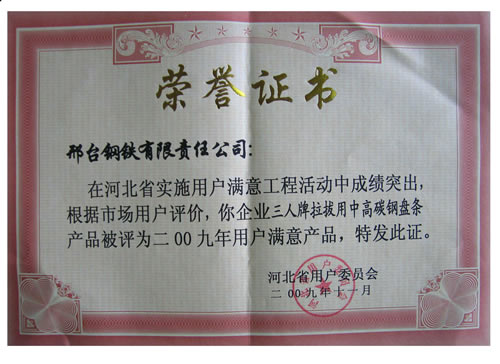 三人牌拉拔用中高碳鋼盤條被評為2009年河北省用戶滿意產(chǎn)品