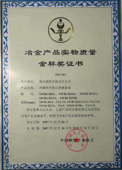 冷鐓和冷擠壓用鋼盤條SWRCH18A...SWRCH35K獲冶金產(chǎn)品實物質量金杯獎