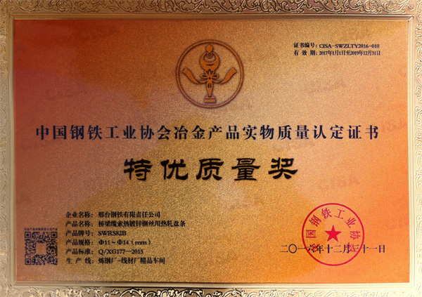 橋梁纜索熱鍍鋅鋼絲用熱軋盤條SWRS82BΦ11~Φ14(mm)獲得冶金產(chǎn)品實(shí)物質(zhì)量“特優(yōu)質(zhì)量獎(jiǎng)”