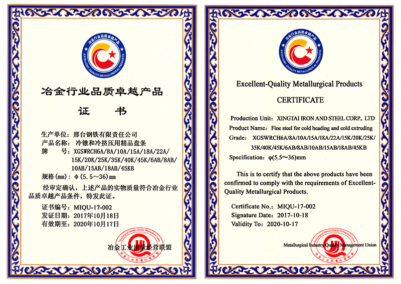 冷鐓和冷擠壓用精品盤條XGSWRCH6A/8A/10A/15A/18A/22A/15K/20K/25K/35K/40K/45K/6AB/8AB/10AB/15AB/18AB/45KB共18個(gè)牌號(hào)φ5.5- 36mm規(guī)格獲冶金行業(yè)品質(zhì)卓越產(chǎn)品