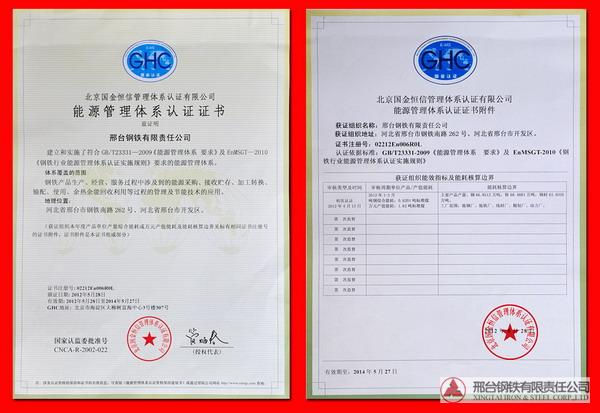 2012年3月至4月,北京國(guó)金恒信管理體系認(rèn)證有限公司對(duì)邢鋼進(jìn)行了能源管理體系認(rèn)證審核并順利通過,2012年5月28日頒發(fā)了證書。