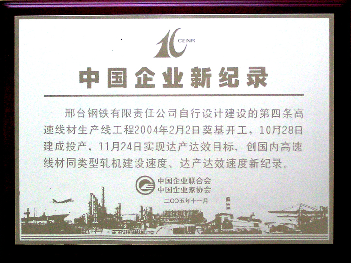 2005年11月,邢鋼自行設(shè)計建設(shè)的第四條高速線材生產(chǎn)線工程2004年2月2日奠基開工,10月28日建成投產(chǎn),11月24日實現(xiàn)達(dá)產(chǎn)達(dá)效目標(biāo),創(chuàng)國內(nèi)高速線材同類型軋機(jī)建設(shè)速度、達(dá)產(chǎn)達(dá)效速度新紀(jì)錄。