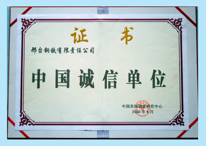 2003年7月,邢鋼獲得中國(guó)行業(yè)企業(yè)信用AAA級(jí)單位評(píng)估證書。