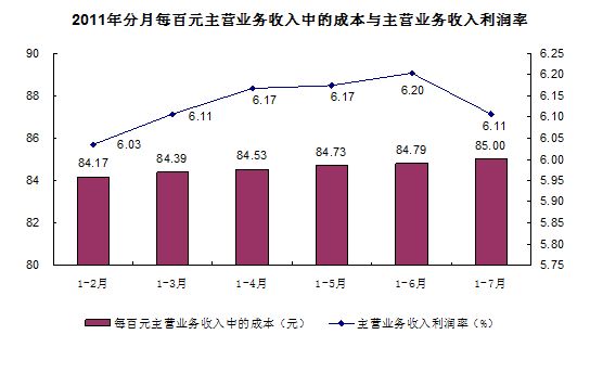 規(guī)模以上工業(yè)企業(yè)實現(xiàn)主營業(yè)務(wù)收入458544億元,同比增長29.8%。每百元主營業(yè)務(wù)收入中的成本為85.00元,主營業(yè)務(wù)收入利潤率為6.11%。