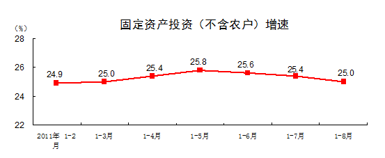 2011年1-8月份,固定資產(chǎn)投資(不含農(nóng)戶)180608億元,同比增長25%,比1-7月份回落0.4個百分點(diǎn)。其中,國有及國有控股投資62422億元,增長12.1%。從環(huán)比看,8月份固定資產(chǎn)投資(不含農(nóng)戶)增長1.16%。