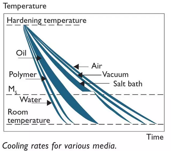 通常應(yīng)該在快速和慢速淬火速率之間的選擇折衷方案。為了獲得最佳的微觀組織結(jié)構(gòu)和工具性能,淬火速率應(yīng)該是快速的。為了使畸變最小化,建議使用較慢的淬火速率。