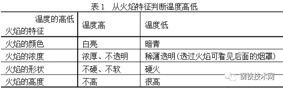 由上二表可見不能只憑一種“視覺信號”就判斷出爐內(nèi)的情況,而是根據(jù)多種信號綜合判斷爐內(nèi)情況,例如要從火焰的顏色、濃度、形狀、高度等來綜合判斷爐內(nèi)溫度情況。在判斷終點含碳量時,既要看火花特征,還可考慮火焰形狀的變化。在收高碳時要看火焰擺動的幅度,由大至小,在收低碳時要看火焰下降情況。