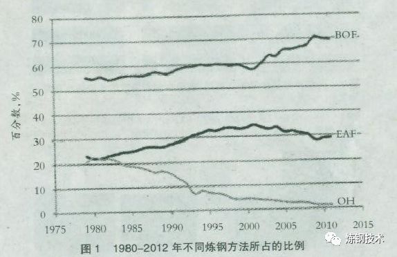 自此,氧氣轉(zhuǎn)爐煉鋼得到快速發(fā)展,而平爐煉鋼開始下降,如圖1所示。氧氣轉(zhuǎn)爐煉鋼發(fā)展超過平爐煉鋼的一個(gè)重要因素是連鑄技術(shù)的引進(jìn)。連鑄要求鋼水源源不斷供應(yīng),而氧氣轉(zhuǎn)爐的工藝時(shí)間比較短,能很容易地滿足連鑄的鋼水供應(yīng),一個(gè)大轉(zhuǎn)爐(350t)的產(chǎn)鋼速度為500t/h。與此相對(duì)照,如果平爐常規(guī)操作,煉鋼至出鋼需要12—14h,或者如果借助工業(yè)用氧加速也需要7—8h。目前在烏克蘭、俄羅斯和印度仍然存在一定數(shù)量的平爐冶煉。這些爐子正逐步被電弧爐取代,2012年平爐工藝總產(chǎn)鋼量1690萬(wàn)t,約占全球鋼產(chǎn)量的1.1%。