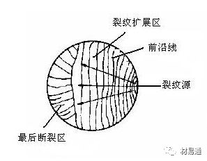 疲勞斷裂經(jīng)歷了裂紋萌生和擴(kuò)展過程。由于應(yīng)力水平較低,因此具有較明顯的裂紋萌生和穩(wěn)態(tài)擴(kuò)展階段,疲勞斷裂的宏觀斷口一般由三個區(qū)域組成,即疲勞裂紋產(chǎn)生區(qū)(裂紋源)、裂紋擴(kuò)展區(qū)和最后斷裂區(qū)。