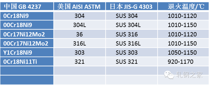 奧氏體不銹鋼的代表鋼種是 18-8 鋼(304),因?yàn)槭菉W氏體組織,所以具有無(wú)磁性 且沒(méi)有淬硬性等特點(diǎn)。由于該鋼種不發(fā)生相變,其熱處理就是加熱到高溫(一般在1000℃以上),奧氏體再結(jié)晶的同時(shí),使在加工中產(chǎn)生的碳化物和。相分解物固溶到奧 氏體中,然后快速冷卻,使碳呈固溶狀態(tài)的奧氏體保持到常溫,這―處理過(guò)程即為固溶處理。表 1 為奧氏體不銹鋼的參考退火溫度。