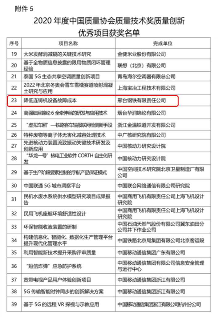 本次評選是為深入落實新時代高質(zhì)量發(fā)展要求,推動我國質(zhì)量技術(shù)進(jìn)步,提高質(zhì)量創(chuàng)新和競爭能力,根據(jù)《國家科學(xué)技術(shù)獎勵條例》和《中國質(zhì)量協(xié)會質(zhì)量技術(shù)獎管理辦法》有關(guān)規(guī)定,結(jié)合2020年度中國質(zhì)量協(xié)會技術(shù)獎(以下簡稱質(zhì)量技術(shù)獎)單列優(yōu)秀項目成果申報情況,經(jīng)質(zhì)量技術(shù)獎評審委員會評審,中國質(zhì)量協(xié)會批準(zhǔn)授予的。邢鋼公司獲獎項目—《降低連鑄機設(shè)備故障成本》為質(zhì)量創(chuàng)新類別單列優(yōu)秀項目成果。