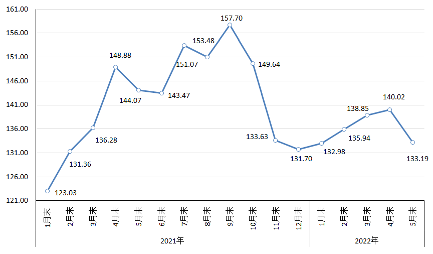 據鋼鐵協會監(jiān)測,5月末,中國鋼材價格指數(CSPI)為133.19點,環(huán)比由升轉降,下降6.83點,降幅為4.88%;同比下降10.88點,降幅為7.55%。(見下圖)