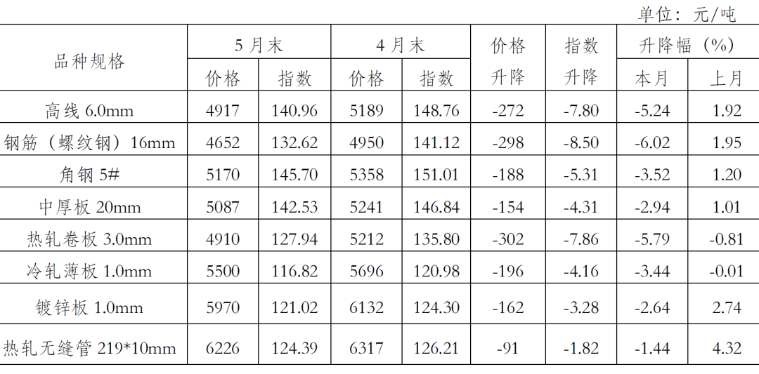 5月份,我國經濟呈現恢復向好勢頭,國內市場鋼材需求雖有所啟動,但仍不及預期;受原燃材料價格回落影響,鋼材價格也有所下降。進入6月以來,鋼材價格小幅波動。