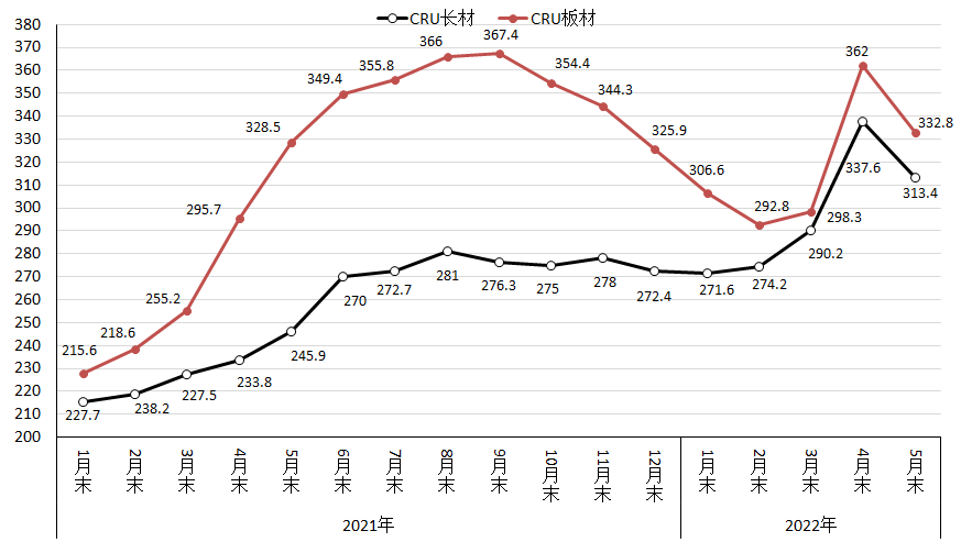 5月份,CRU長材指數為313.4點,環(huán)比下降4.7點,降幅為1.4%;CRU板材指數為332.8點,環(huán)比下降29.2點,降幅為8.1%,比長材降幅高2.2個百分點;與去年同期相比,CRU長材指數同比上升87.0點,升幅為35.4%;CRU板材指數同比上升4.3點,升幅為1.3%。(見下圖)
