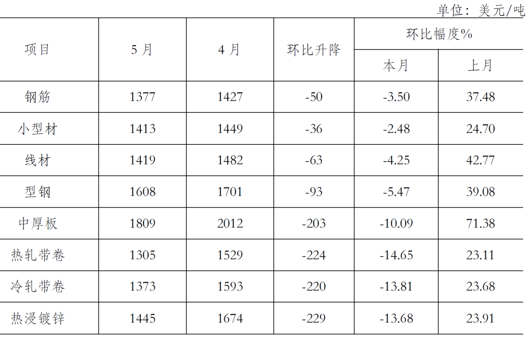 5月份,鋼鐵產量持續(xù)環(huán)比增長。吉林,上海等疫情嚴重地區(qū)開始復工復產、國家穩(wěn)增長政策相繼出臺,對需求的拉動還不明顯,國內市場鋼材需求增長不及預期,加上鋼鐵生產環(huán)比增長,以及原燃材料價格在前期大漲后有所回落,致使鋼材價格呈小幅下行走勢。