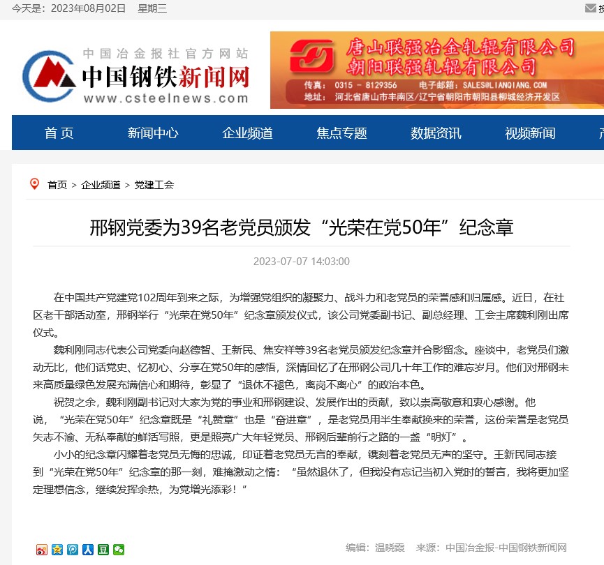 魏利剛同志代表公司黨委向趙德智、王新民、焦安祥等39名老黨員頒發(fā)紀念章并合影留念。座談中,老黨員們激動無比,他們話黨史、憶初心、分享在黨50年的感悟,深情回憶了在邢鋼公司幾十年工作的難忘歲月。他們對邢鋼未來高質(zhì)量綠色發(fā)展充滿信心和期待,彰顯了“退休不褪色,離崗不離心”的政治本色。