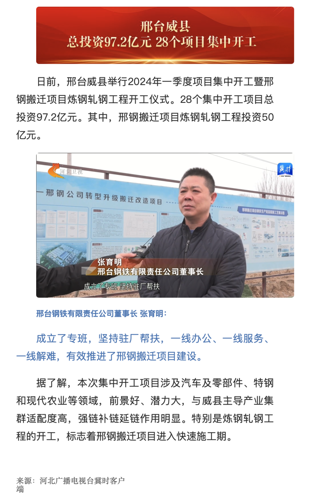 邢鋼搬遷項(xiàng)目既是威縣落實(shí)省市戰(zhàn)略部署,布局縣域新材料產(chǎn)業(yè)基地的重大決策,也是打造威縣300億元特鋼產(chǎn)業(yè)集群的龍頭項(xiàng)目、戰(zhàn)略支撐項(xiàng)目。