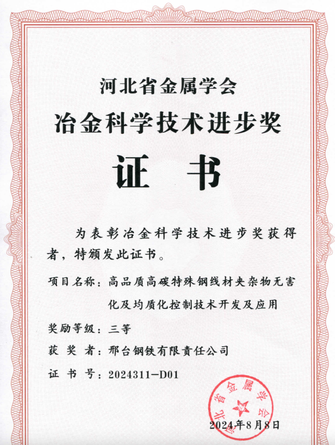 近日,邢臺(tái)鋼鐵有限責(zé)任公司兩項(xiàng)科技成果“新能源汽車用高強(qiáng)度超高潔凈度冷鐓鋼生產(chǎn)關(guān)鍵技術(shù)創(chuàng)新及應(yīng)用”“高品質(zhì)高碳特殊鋼線材夾雜物無害化及均質(zhì)化控制技術(shù)開發(fā)及應(yīng)用”得到河北省金屬學(xué)會(huì)專家評審委員會(huì)的高度認(rèn)可,分別榮獲2024年度 “河北冶金科學(xué)技術(shù)獎(jiǎng)”一、三等獎(jiǎng)。