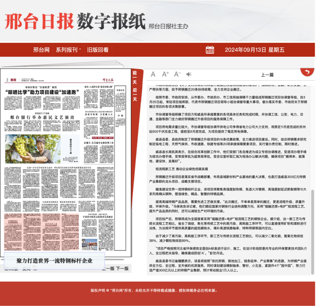 威縣縣委、縣政府制定了邢鋼搬遷升級(jí)項(xiàng)目的16條優(yōu)惠政策,全力推進(jìn)項(xiàng)目建設(shè)。同時(shí),結(jié)合邢鋼需求研究制定臨電工程、天然氣保供、市政道路、鐵路專線等20項(xiàng)承接保障要素項(xiàng)目,實(shí)行督辦責(zé)任制,限時(shí)推進(jìn)。