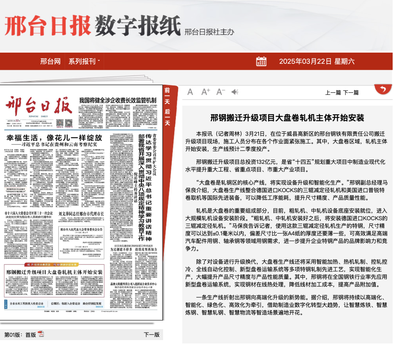 3月21日,在位于威縣高新區(qū)的邢臺鋼鐵有限責任公司搬遷升級項目現(xiàn)場,施工人員分布在各個作業(yè)面緊張施工。其中,大盤卷區(qū)域,軋機主體開始安裝,生產(chǎn)線預(yù)計二季度投產(chǎn)。