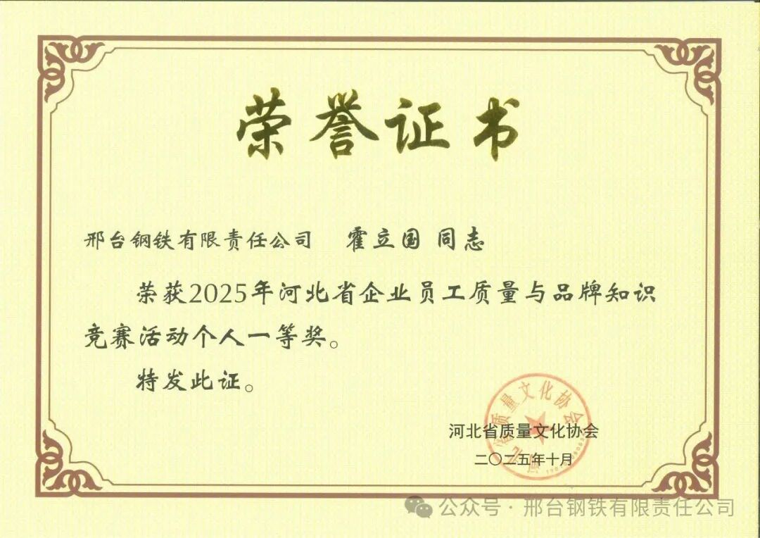 近日,2025年河北省企業(yè)員工質量與品牌知識競賽結果揭曉,邢臺鋼鐵有限責任公司憑借出色的組織工作和員工優(yōu)異的答題表現,榮獲“優(yōu)秀組織獎”,6名員工分獲個人一、二、三等獎。
