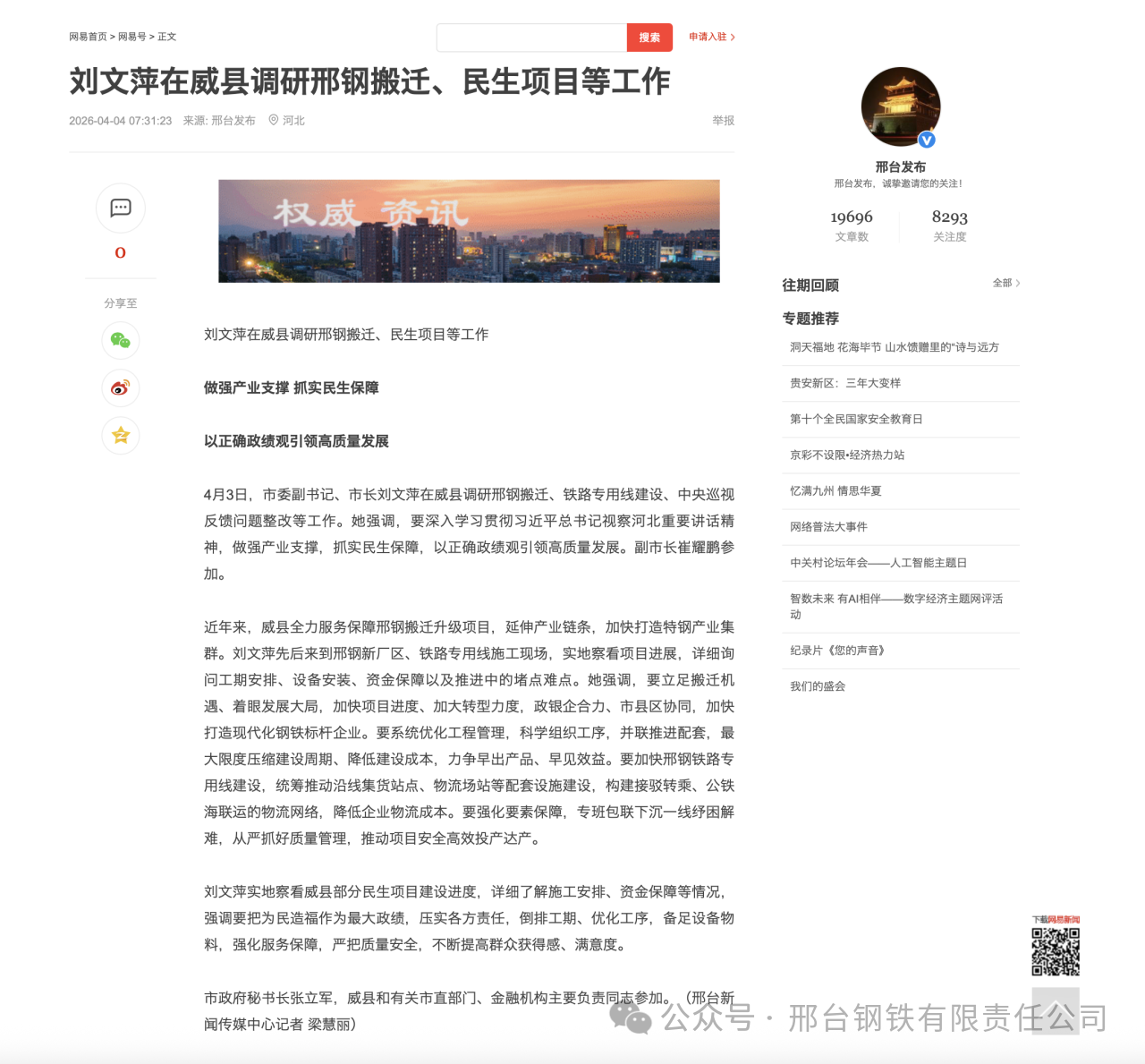 4月3日,市委副書記、市長劉文萍在威縣調研邢鋼搬遷、鐵路專用線建設、中央巡視反饋問題整改等工作。她強調,要深入學習貫徹習近平總書記視察河北重要講話精神,做強產(chǎn)業(yè)支撐,抓實民生保障,以正確政績觀引領高質量發(fā)展。副市長崔耀鵬參加。